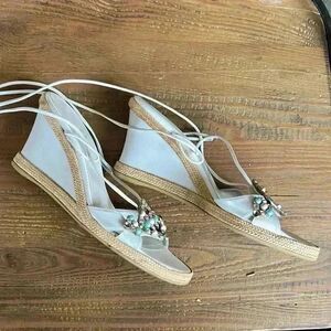 White leather Stuart Weitzman sandals/espadrilles. Colored stones include turquoise, white, pink, and amethyst. White leather straps, that tie around the ankle or up the leg.