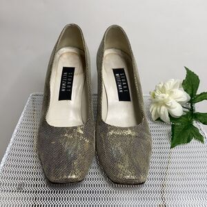 Stuart Weitzman Leather Gold Metallic Shimmer Block Heel Square Toe Pumps