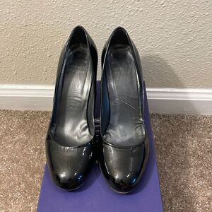 Stuart Weitzman Black Patent Leather Pumps, Size 7.5. These are pre-loved and great pumps! Ready for a second home. They have some wear and tear but on the whole still good condition