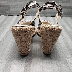 Black and white gingham print textile slingback wedge espadrilles with pointed toe. Features adjustable slingback strap, 4 inch wedge heel and 1/2 inch toe platform.