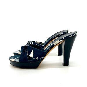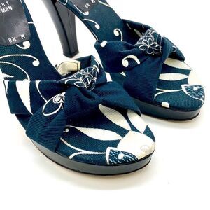 Features navy blue and white floral print on corduroy with center knot and black patent leather platform and heel.