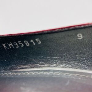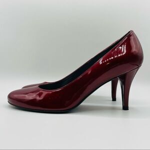 These beautiful Ruby red pumps are in great pre-owned condition. The bottoms show little wear, but there is some writing that transferred onto the side of one shoe (see pic). They are a pretty shade of metallic cherry red. The bottoms are leather. The heels is approximately 3 1/2”.