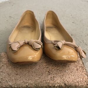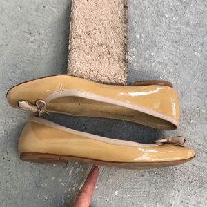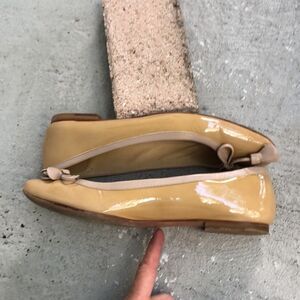 Tan Patent leather with leather trim square toe flats.These are in good condition check out the pictures