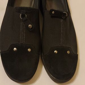 Suede, leather and elastic blend wedges. Slip resistant soles , shock absorbent.  Front decorative zipper with silver studs.  Excellent used condition.  Please refer to photos for more details.  Smoke and pet free home.
