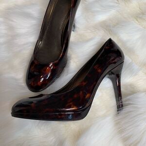 Gorgeous patent/shiny heels by Stuart weitzman. Great condition with very slight scuffs to exterior that are not noticeable when wearing. Name on insole slightly worn but still present on bottom. Slight wear on soles as shown. Heel height 4”