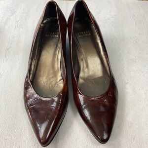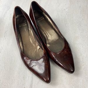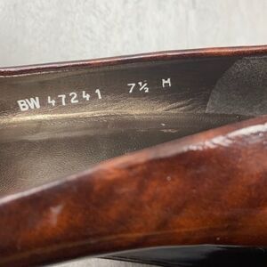 Very nice. 7.5 patent leather brown heel with pointy toe and wedge heel. A few creases in the leather right around the toe as pictured.