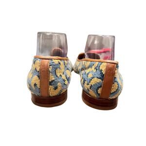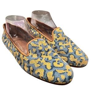 Excellent preowned condition. Needlepoint upper shows gentle surface wear and minor fraying consistent with normal use. Leather trim has light scuff marks in places. Leather soles show typical preowned wear but remain structurally sound. No holes or major flaws.