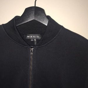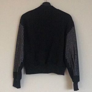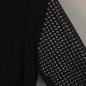This black jacket features studded sleeves, zipper down the front. And 2 side pockets. It feels like a sweatshirt material. Looks good for any casual outfit over jeans. Easy to toss on. Please keep in mind the black color has faded a little after washes.