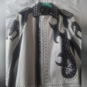 Real leather Stylish black and white jacket with studded details. Features intricate designs on the front and sleeves.