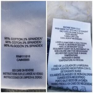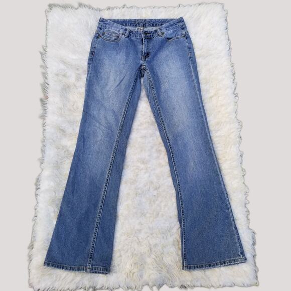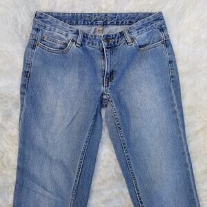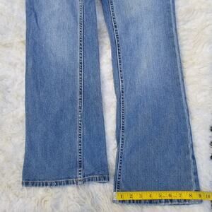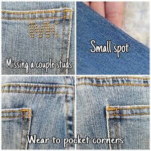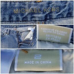 Medium wash stretch denim w/ factory fading, sanding, whiskering. 5 pocket, button/zipper fly, boot cut silhouette. Michael Kors MK in metal studs on rear pocket. Issues noted in photos. Good preowned condition, overall. Size 2 by Michael Kors.