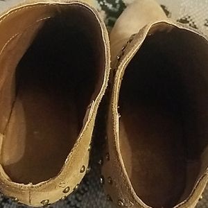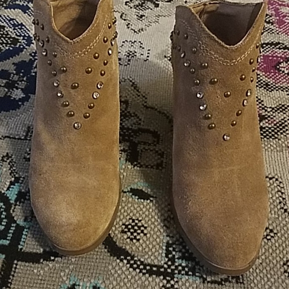 These are a soft suede material with rhinestones around them and little beads. Only wore about five to six times. The glue inside on the black from wearing is starting to come up a bit, but definitely still got plenty of wear left.