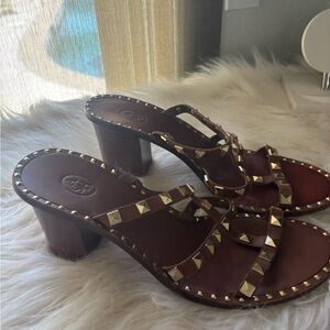 Stylish brown sandals featuring gold studded accents. Perfect for casual outings. Size 40 European fits like an 8.5 women's