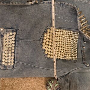 Elevate your style with this edgy studded denim jacket. Featuring silver studs and a classic blue denim color, this jacket is perfect for making a bold statement. Ideal for casual outings or adding a touch of rock-chic to your wardrobe.