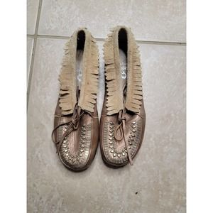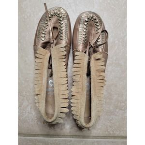 Step out in style with these chic studded fringe loafers. Perfect for any casual outing, these brown flats offer both comfort and flair.