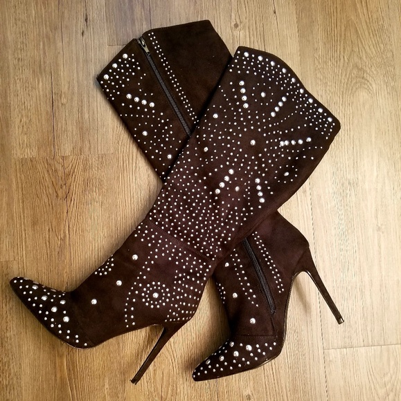 Faux Suede, Black Knee Boot, Silver Studded Detail, Zipper Inside Leg, 3" Heels