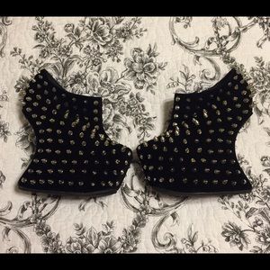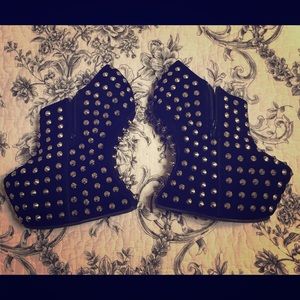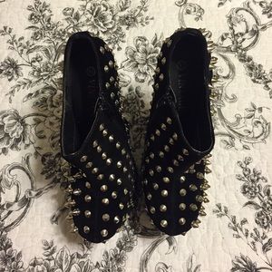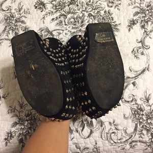 Add some drama toe your look with these killer heel less wedges! It features studded spike all over upper, round toe front, all over spike covered suede platform, and unique curved wedge heel. Finished with lightly padded insole and side zipper closure for easy on/off. Worn only twice. 💎