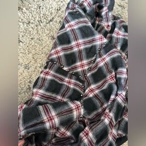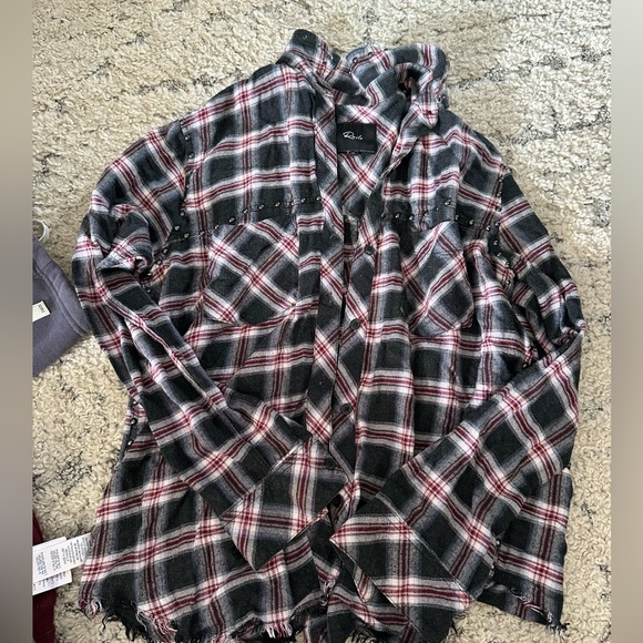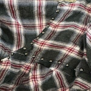 Super soft, Raw hem, and studded flannel. A little bit oversized. Fits more like a small.