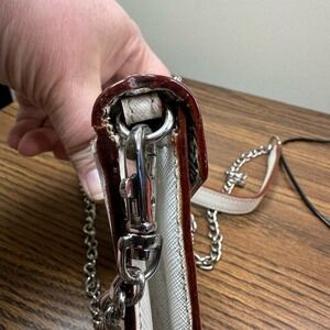 Preowned cute little studded Rebecca Minkoff white shoulder bag or clutch. You can carry it either way. Bag has one main compartment and three slip pockets. Great for carrying just necessities on a night out. My iphone 14 promax with a cover on it is a little too big to fit inside, but any phone smaller would fit. That will still leave room for cards and car keys.