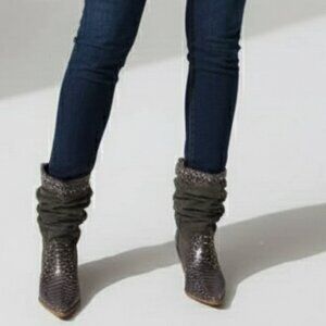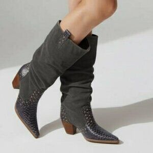 Turn heads with these statement mid-calf boots featuring a striking mix of textures and details. The pointed toe and wooden block heel bring Western-inspired vibes, while the snakeskin pattern with gold stud accents adds a modern, edgy twist. Finished with soft suede uppers for comfort and style.