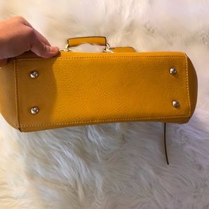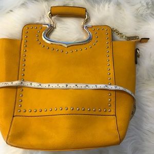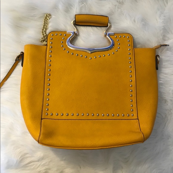 Studded handbag with gold detailing. Inner part is clean one zipper pocket on the inside and one on the outer part. The a scratch on the back of the purse.