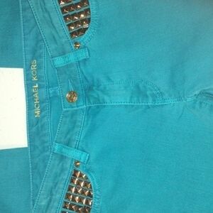Studded turquoise/aqua/teal Michael Kors skinny jeans with gold studs size 0