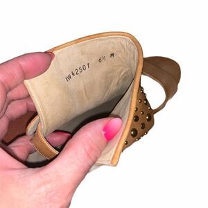 Studded ankle cuff sandals in tan color. Size 6.5. Gold studs and gold buckle. Very stylish and comfy. Has scuff in the front - toe, please check pictures. It is Not really noticeable when wear the shoes.
