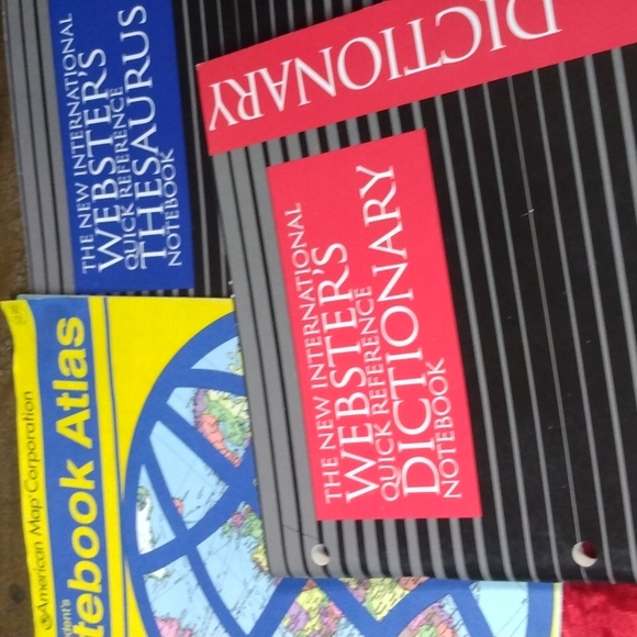 includes : The New International Webster's quick reference dictionary notebook, The New International Webster's quick reference thesaurus , & student's notebook atlas. all in very good used condition. thank you for shopping with me!