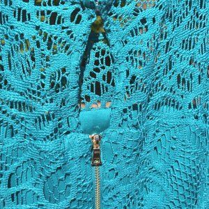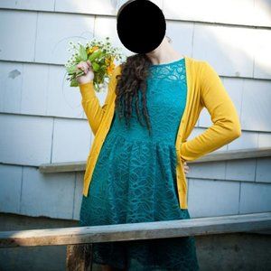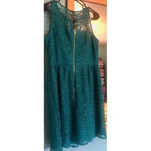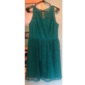 Knee length, teal, lace dress. Well constructed dress and is of great quality materials. Does not feel thin or cheap. Bronze zipper compliments the teal. Very comfortable and fun. Can be dressed up or dressed down for more casual settings. Great for weddings, spring, Easter, summer or vacation. Comfortable, loose, flowy. Wore this to my brother's wedding, it's in great shape.