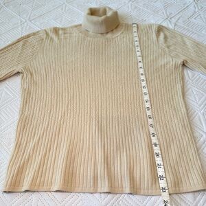 Stylish cream turtleneck sweater with ribbed design. Perfect for cozy days.