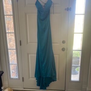 Step into elegance with this stunning teal evening gown. Perfect for any formal occasion, this dress offers a flattering fit and a graceful silhouette. Halter v-neckline, fitted flare slim satin skirt with lace-up back and sweep train. Silky Satin. Bra padding added. Also added a little mesh insert that can be cut out. Gorgeous turquoise color. See all photos.