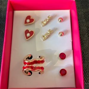 All the studs your heart desires! A timely gift set of five pierced stud earrings in gleaming goldtone with red accents. The set includes: one pair of goldtone round studs, one pair of faceted red stone studs, one pair of goldtone love-outline studs, one pair of heart-shaped studs with clear accents and one pair of red heart-hoop studs.