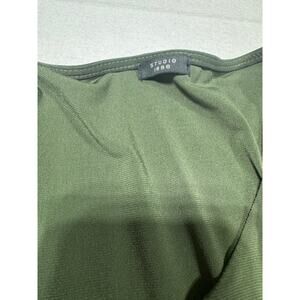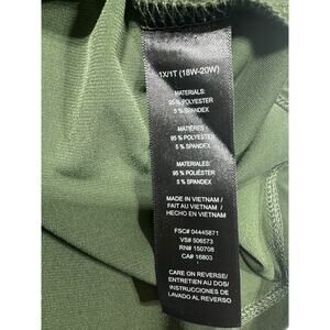 This Studio 1886 green v-neck top features stylish gold ring accents along the neckline for a bold touch. Crafted from a soft, stretchy polyester-spandex blend, it offers a comfortable and flattering fit. The top measures 30.5 inches in length and 25.5 inches across the chest, perfect for casual or dressy looks. Size 1X (18W-20W). Excellent used condition