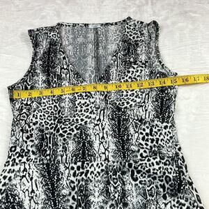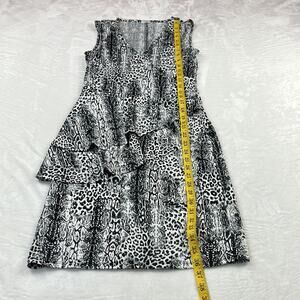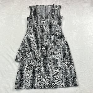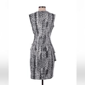 Fetching leopard print sheath in black and white. Sleeveless, with wrap style v neck and asymmetrical double ruffled skirt. Nice amount of stretch, pullover, no pockets.