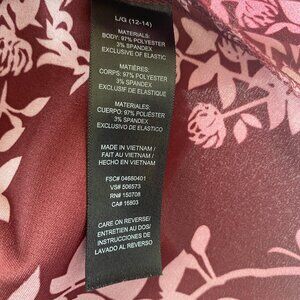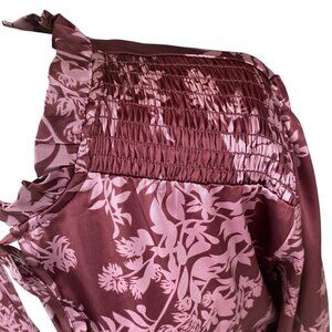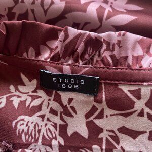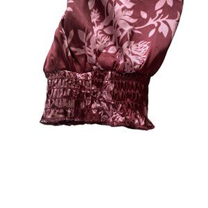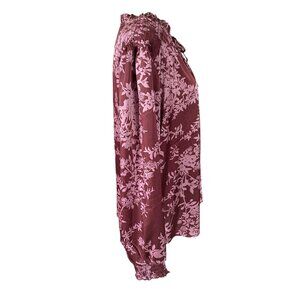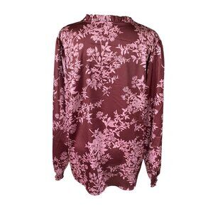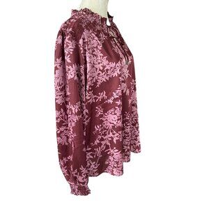 Women's Studio 1886 plum long sleeve pullover floral blouse, size Large 12-14. This has a ruffled neckline with a tie front closure, accordion style elastic at shoulders and wrists. Excellent like new condition and from a smoke free pet free home. Quick shipper!