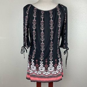 Fun colors and design on this boho style tunic. It measures 19 inches armpit to armpit laying flat and is 30 inches in length.