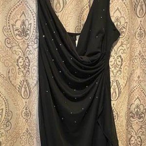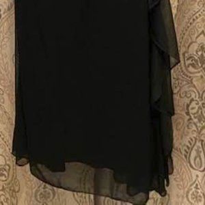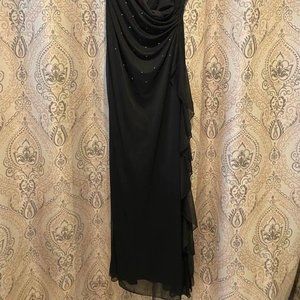 Full-length Studio 1940 black stretch gown. Bustline is layered one side over the other, with the waist gathered at the side for slimming effect. Rhinestones accent torso area, but taper off as the dress descends. Crepe layer over entire dress fans out and flows the length of the skirt. Bust 38"; Waist 28"; Hips to 40". Length 44" waist to floor. Hand wash; line dry.
