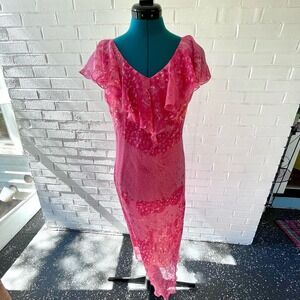 Elegant pink midi dress with floral pattern. Features ruffled sleeves and a flowing silhouette. Perfect for any occasion.