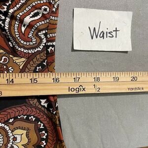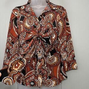 Studio 1940 browns, white, and black Paisley print stretch knit button up 3/4 sleeve top with tie in front in Excellent vintage condition!