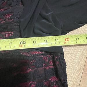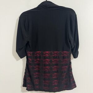 The Studio 1940 Top is a stylish women's blouse in black with a red floral lace overlay, perfect for formal occasions. This top features short sleeves, a pullover closure, and a fitted classic sleeve design.