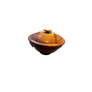 Studio Art Ceramic Platter by Walt Glass, Vintage bowl The pot has a rounded shape with a slightly wider bottom and tapers towards the top. The lid is domed with a small handle on top for easy lifting. The pot also features two side handles, allowing for carrying. The ceramic finish gives it a smooth and polished appearance, and the color is a warm brown with subtle variations in tone