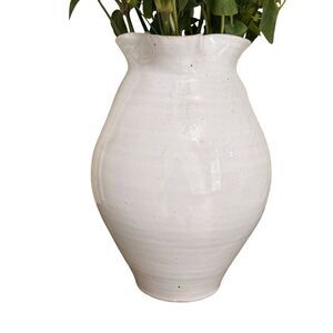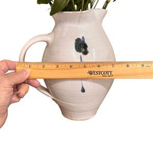 Made in the United States using pottery production techniques, this 7" long and 9" tall pitcher jug is a contemporary piece that will complement any style. It is an original, handmade item with initials T S signed on the bottom.