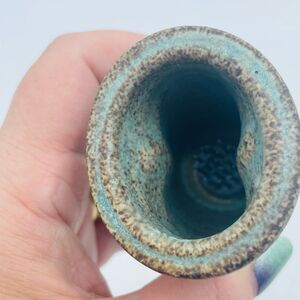 Very unique shape…metal floral prongs inside to make your own little wild flower floral arrangement. Glaze reminds me of weathered copper. See all images for more info and details.