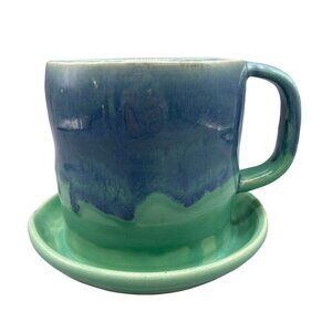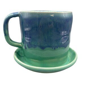 Studio Art Pottery Large Cup with Saucer Planter Green Blue Handled