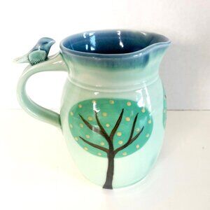 Studio Art Pottery Pitcher Hand Painted Tree with Bird on Handle Celadon Color