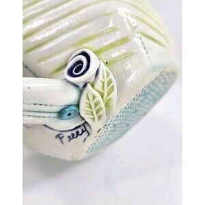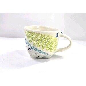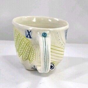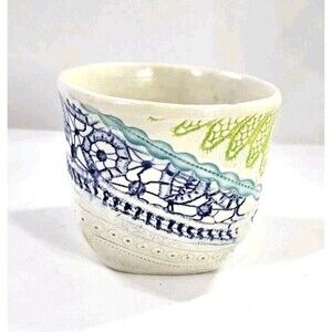 Studio Art Pottery Slab Built Coffee Tea Mug Abstract Floral Blue Green White Lg