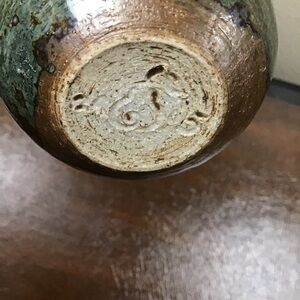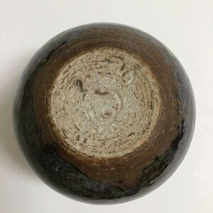 Nice Japanese style, green glaze over brown cup/bowl is signed, but cannot identify the mark? Incised with 2015 separated by a Pear mark in the center. Swirl base interior.