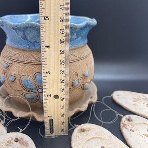 Studio Art Pottery Wall Pocket Planter Wind Chime Blue Brown Floral, Signed