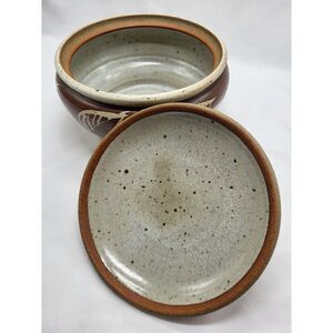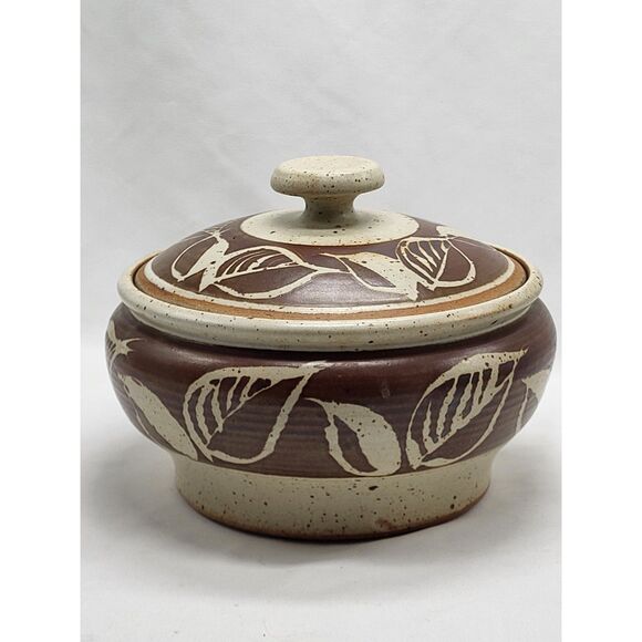 This a a really lovely and well crafted stonewear covered casserole or bean pot. It is signed and in excellent condition. This item is in excellent condition, has no chips cracks or crazing. The glaze is wonderful and the leaf design is beautiful with the browns and creme colors.