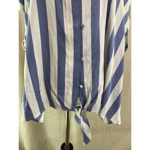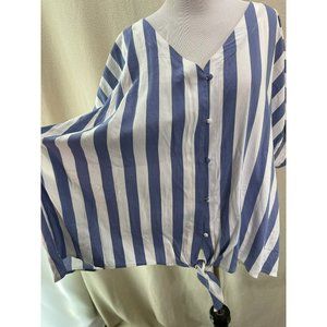 Studio B by Bobeau Blue & White Vertically Striped Front Tie Knot Button-up Blouse. Size 3X Measures: 28.5“ (57“D) armpit to armpit, 45.5“ front length, 46.5" back length. Preowned, Little to no wear. No discoloration, fading, marks/stains, rips or holes. Clean, smoke-free home.