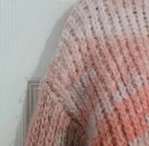 This is a Studio B By Bobeau knitted sweater. Womens juniors size small. It's designed with a tight knitted/crocheted style, pink and orange color, and a fun camouflage pattern. It's cropped length with long sleeves. It's been worn a few times but still in great condition, no holes or stains.